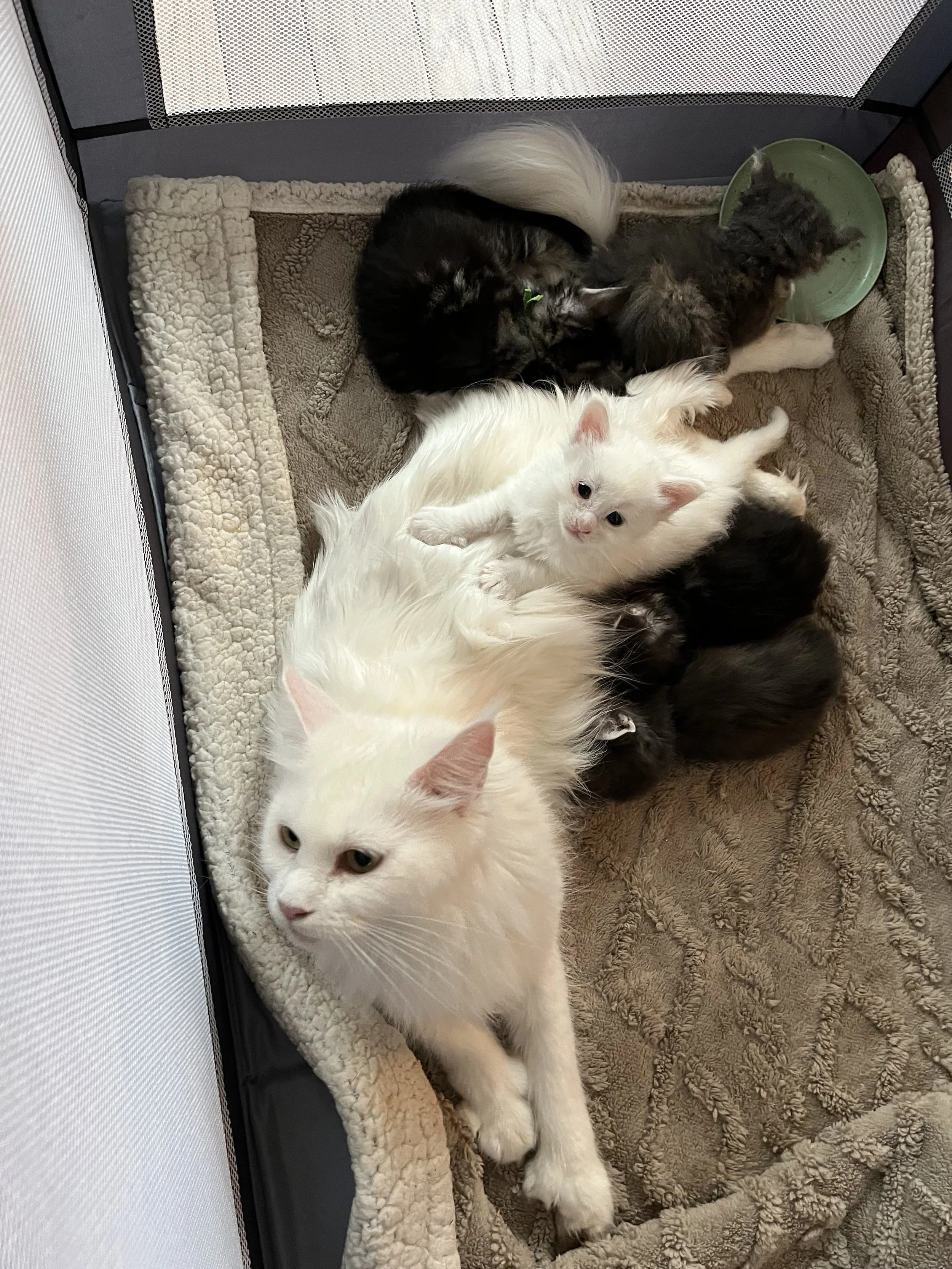 Our mama cats start taking longer breaks this week. They’ll leave their sleeping kittens and come spend time with the family and catch up on their own snuggle time. They love to curl up in a lap and get some special attention too, but as soon as she hears a kitten meow, mom races back to her babies and gathers them all up for a feeding and bath time.